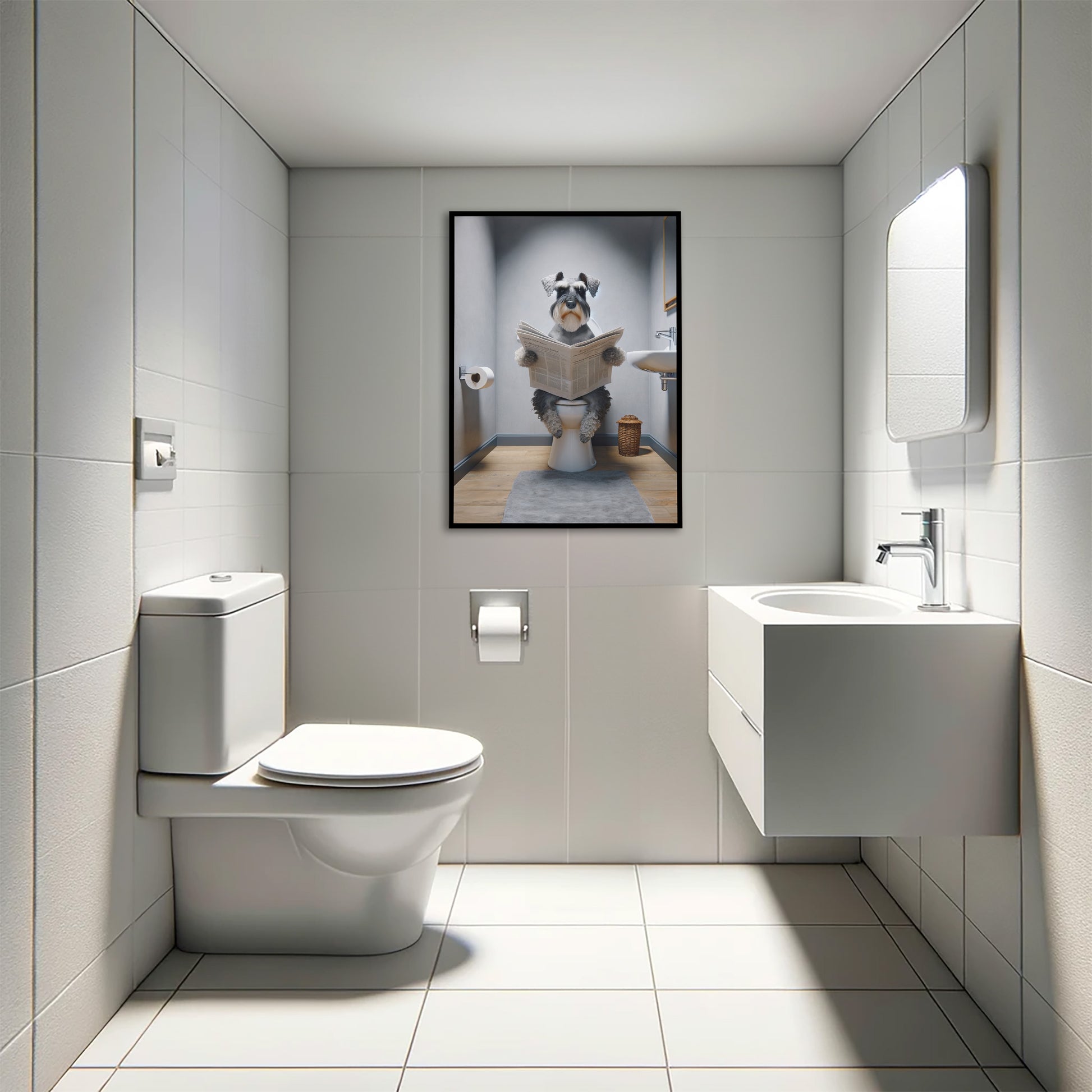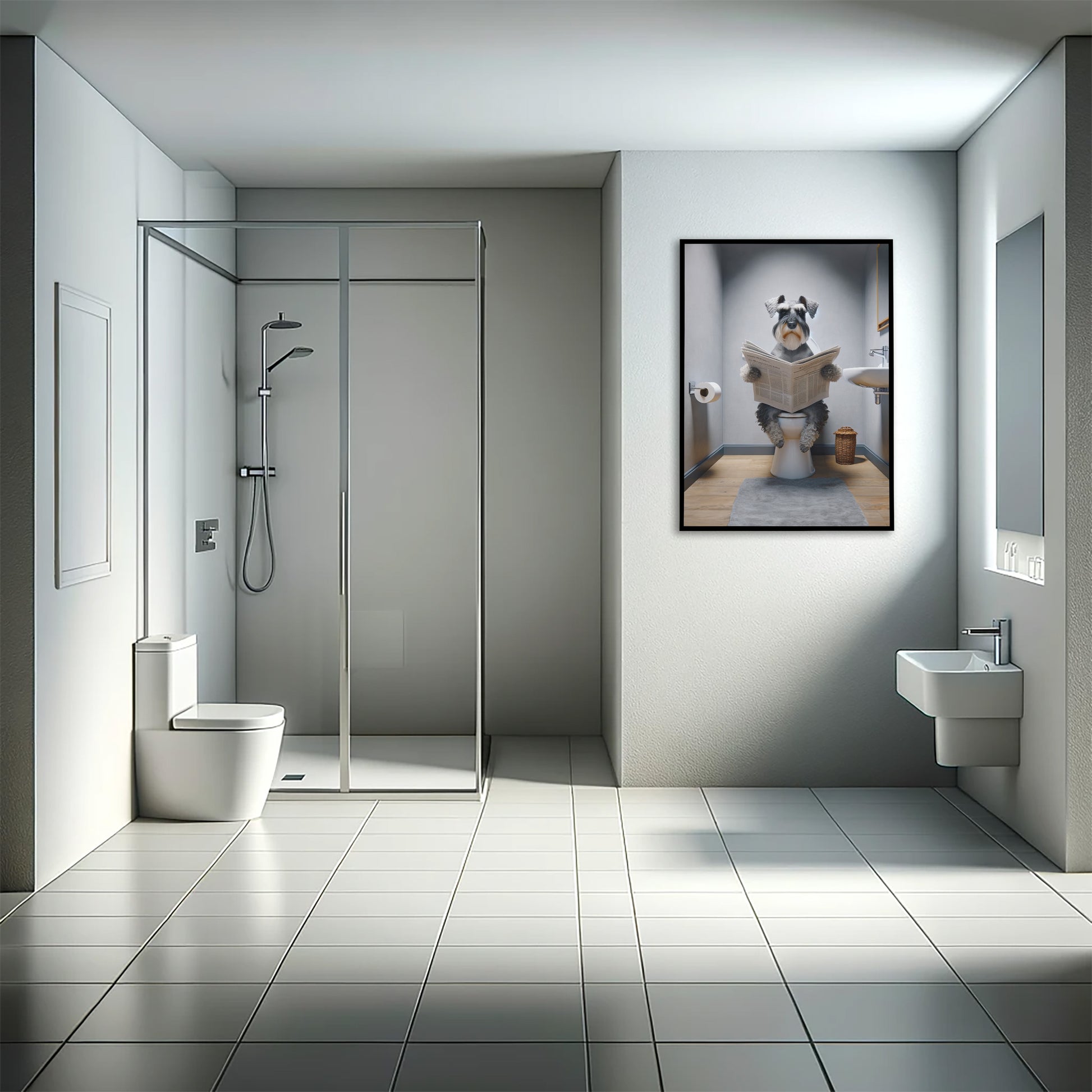 In a world where every detail in your home reflects aspects of your personality and taste, our "Photograph of a Miniature Schnauzer Reading the Newspaper on the Toilet" poster is more than just funny bathroom decor. It's a testament to your unique sense of humor and a love for original, high-quality wall art. Perfect as a conversation starter, a mood brightener, or a quirky gag gift, this poster is sure to bring smiles and a touch of whimsy to any space.
