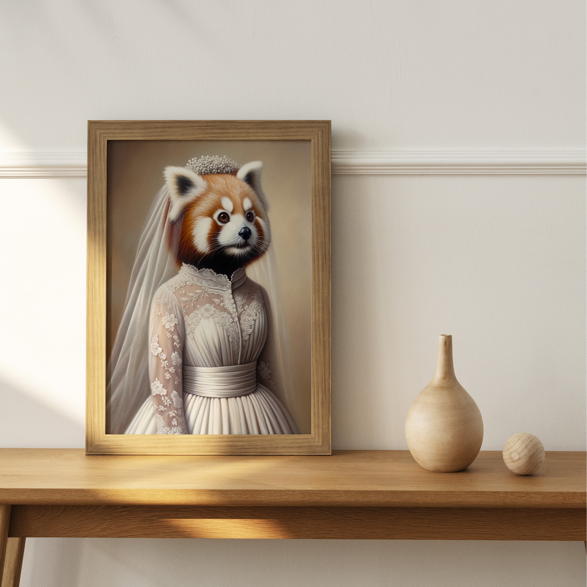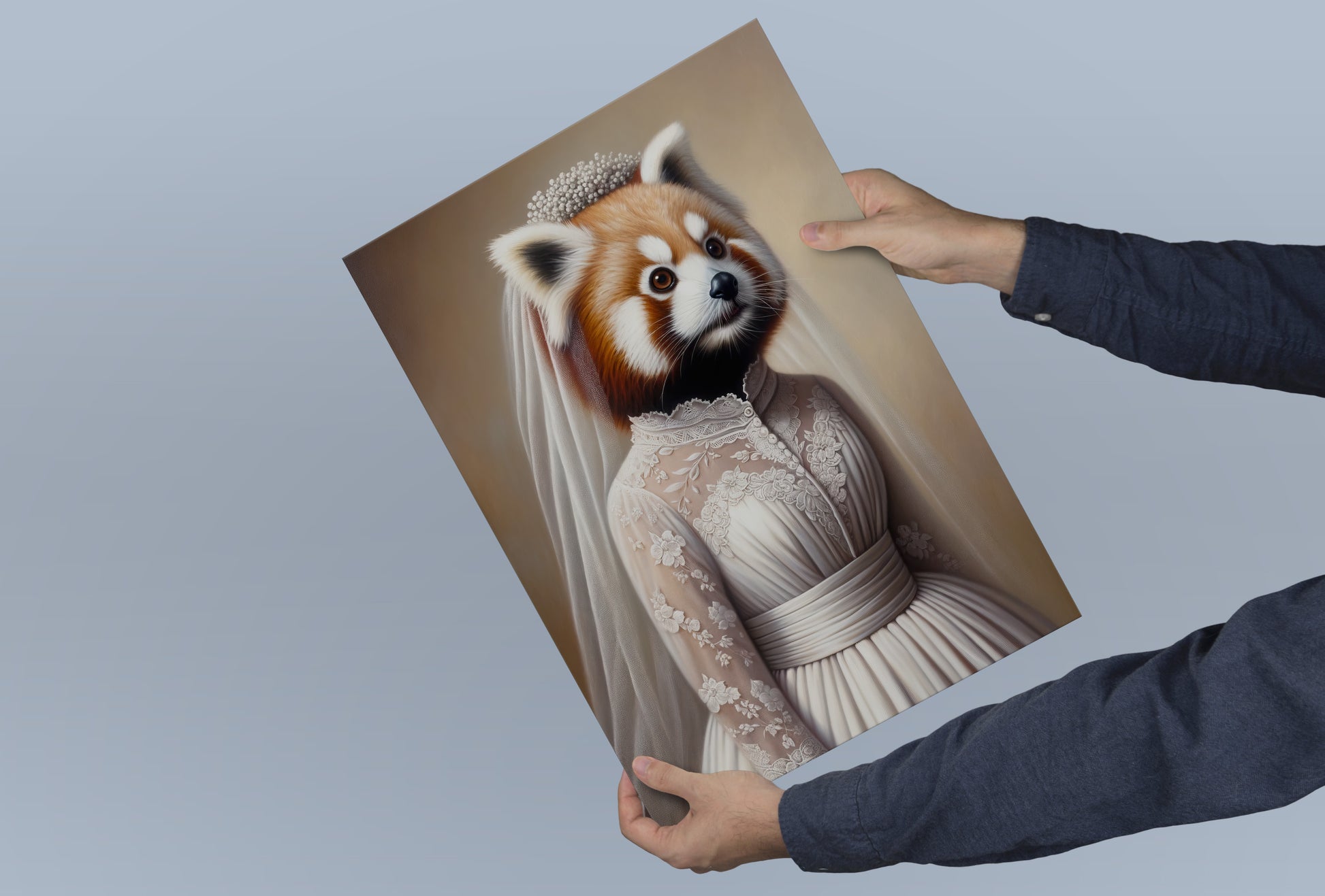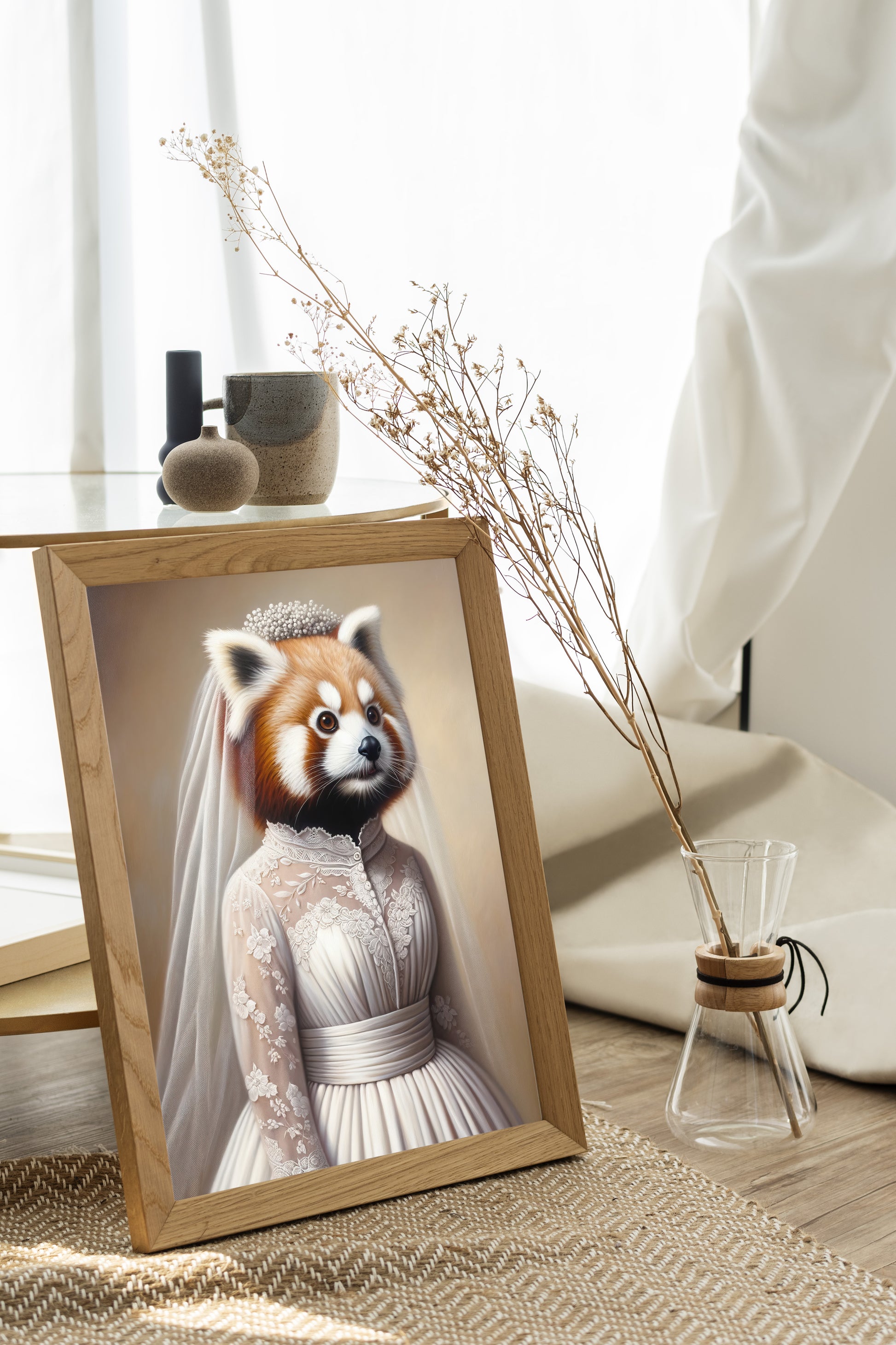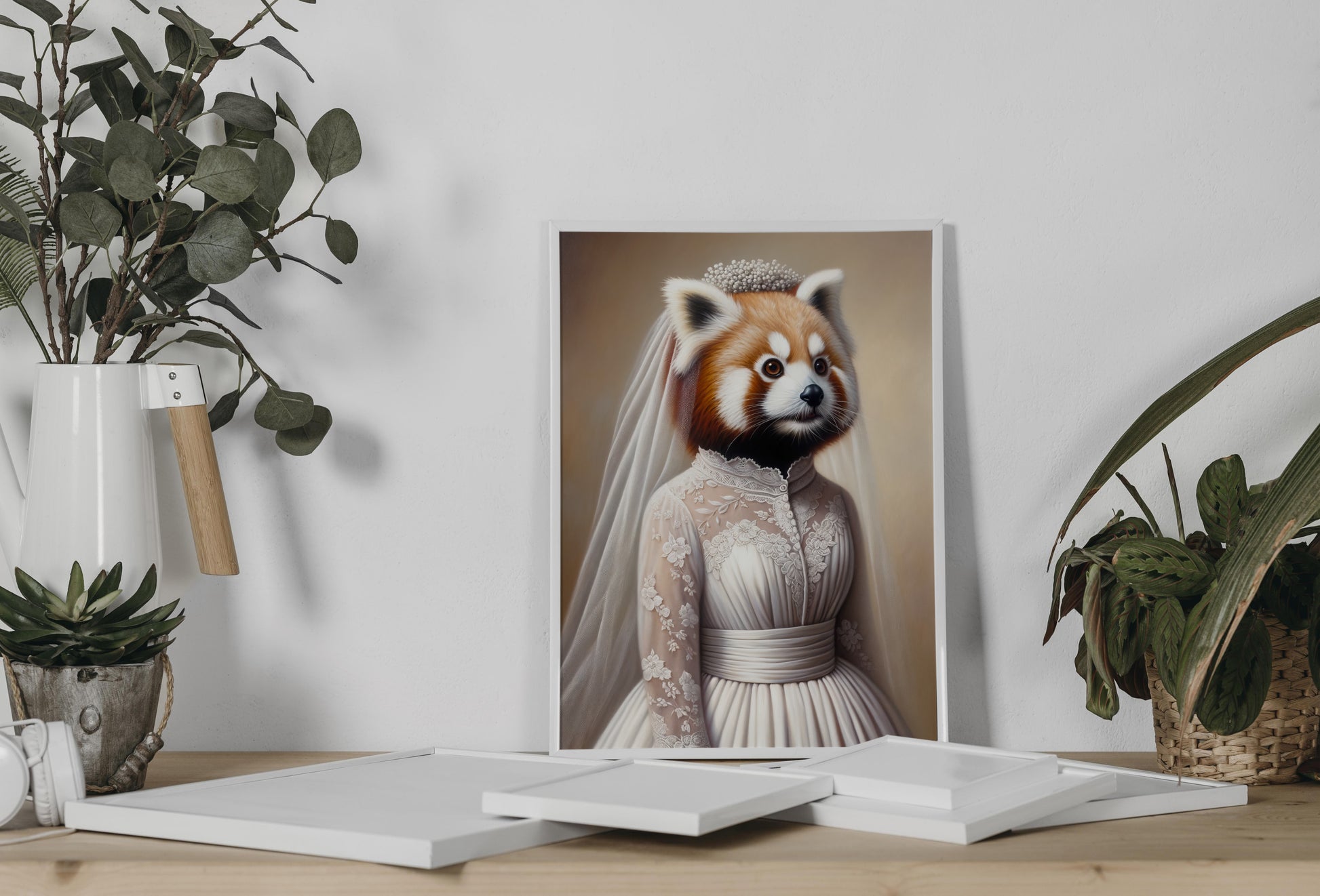Discover the Charm of "Portrait of a Red Panda Wearing a Wedding Dress" - A Unique Bite of Humor for Your Walls