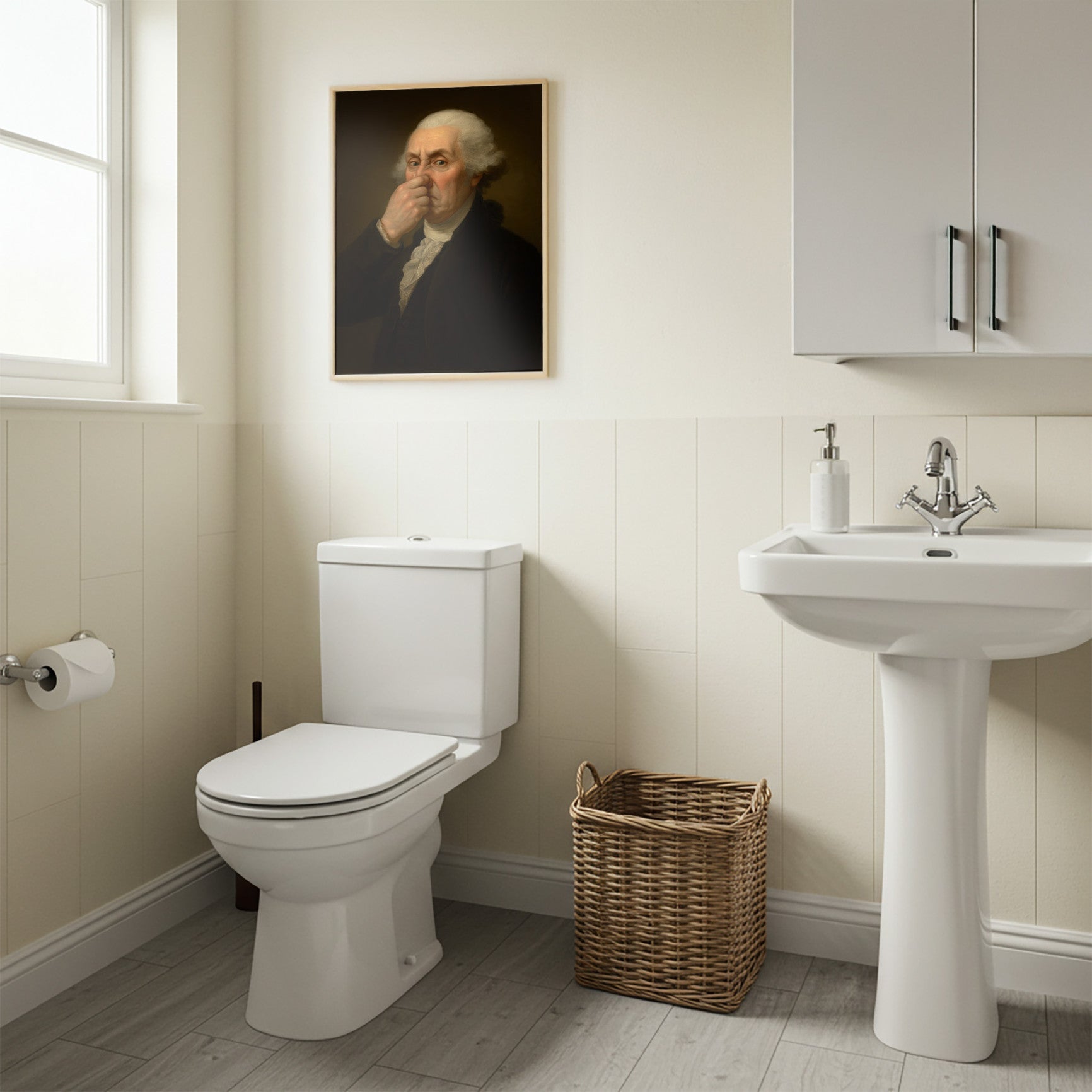 George Washington Pinching His Nose - Funny Bathroom Poster for Quirky Restroom Decor