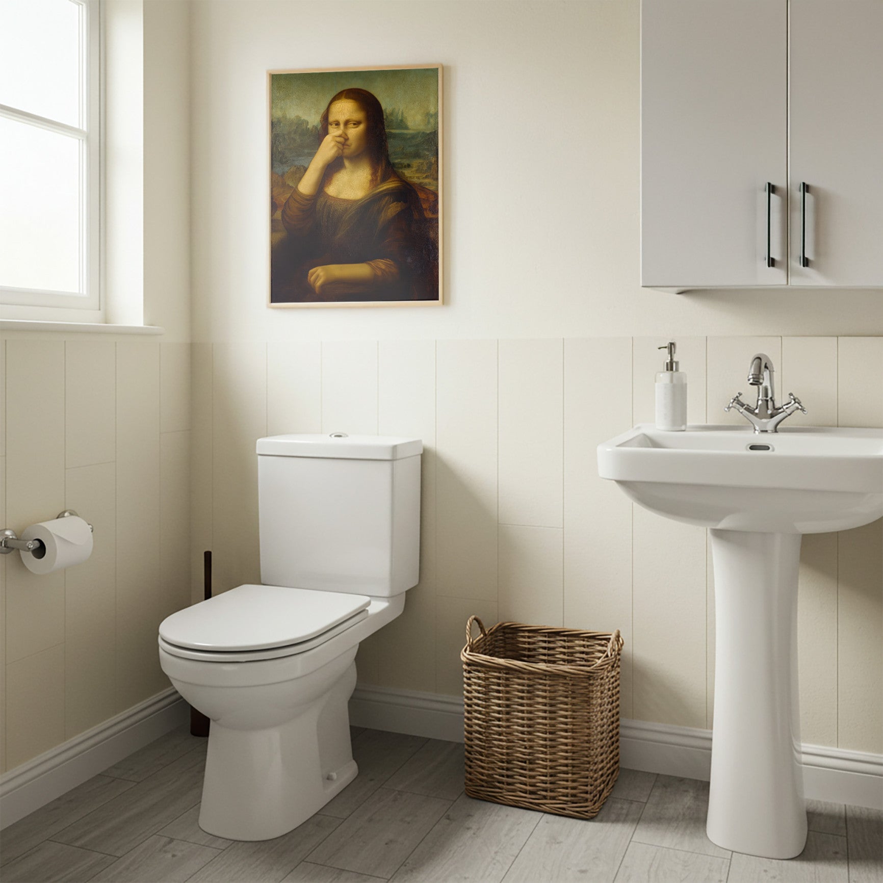 Funny Mona Lisa Bathroom Poster – Quirky Da Vinci Parody Wall Art for Restroom Decor, Toilet Humor, Framed Artwork, Unique Gift