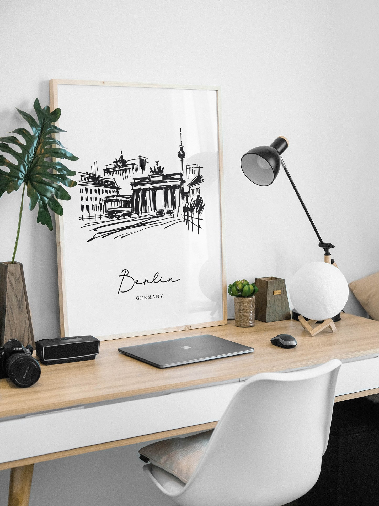Cette illustration noire et blanche de Berlin se distingue par sa capacité à ajouter une touche artistique et intemporelle à votre décoration intérieure. Que ce soit dans votre salon, chambre ou bureau, ce poster se marie parfaitement avec tout type de mobilier et de décoration d'intérieur. Les contrastes audacieux et la simplicité monochrome en font une pièce idéale pour les amateurs de design épuré.
