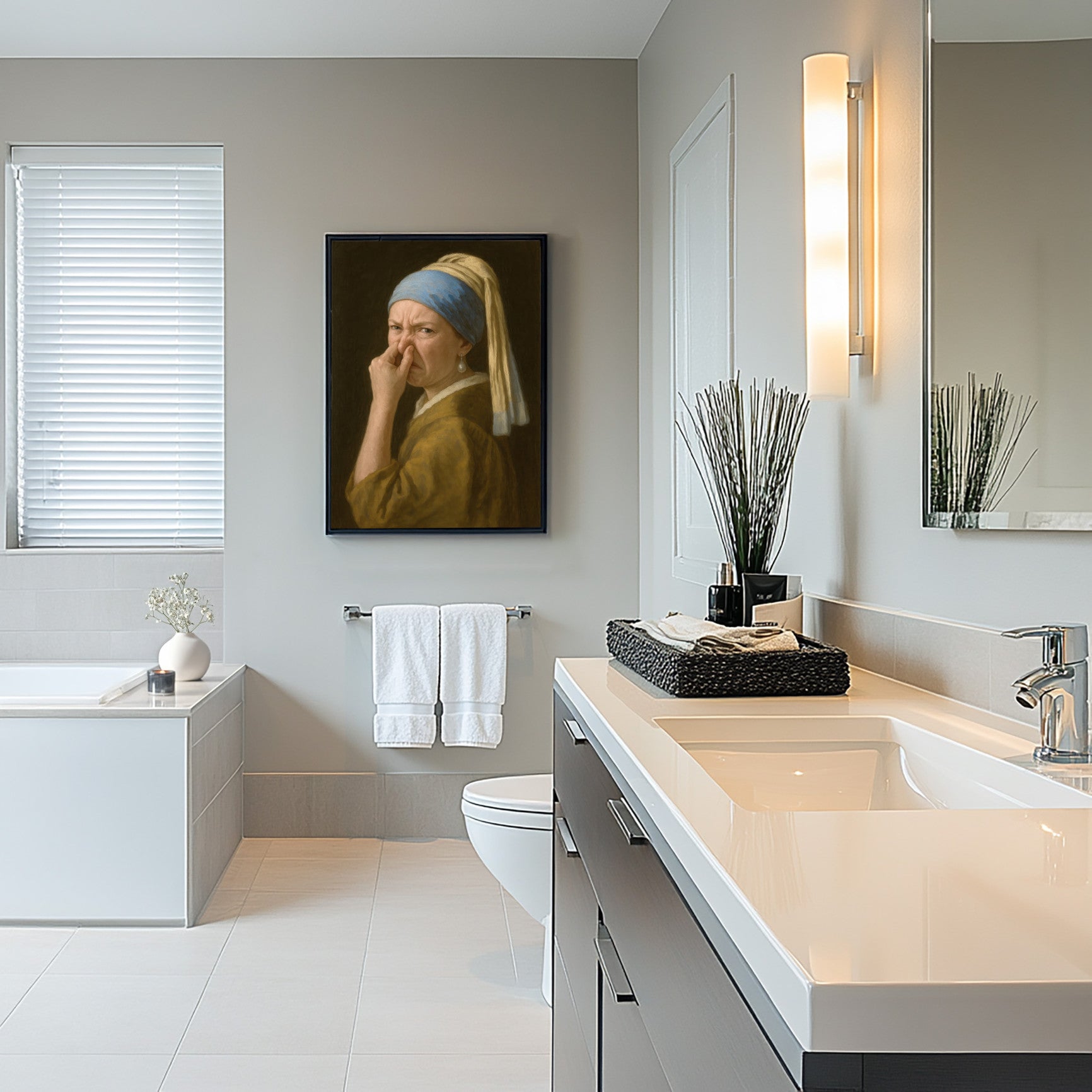La Jeune Fille à la perle se pinçant le nez : une affiche insolite pour vos toilettes
