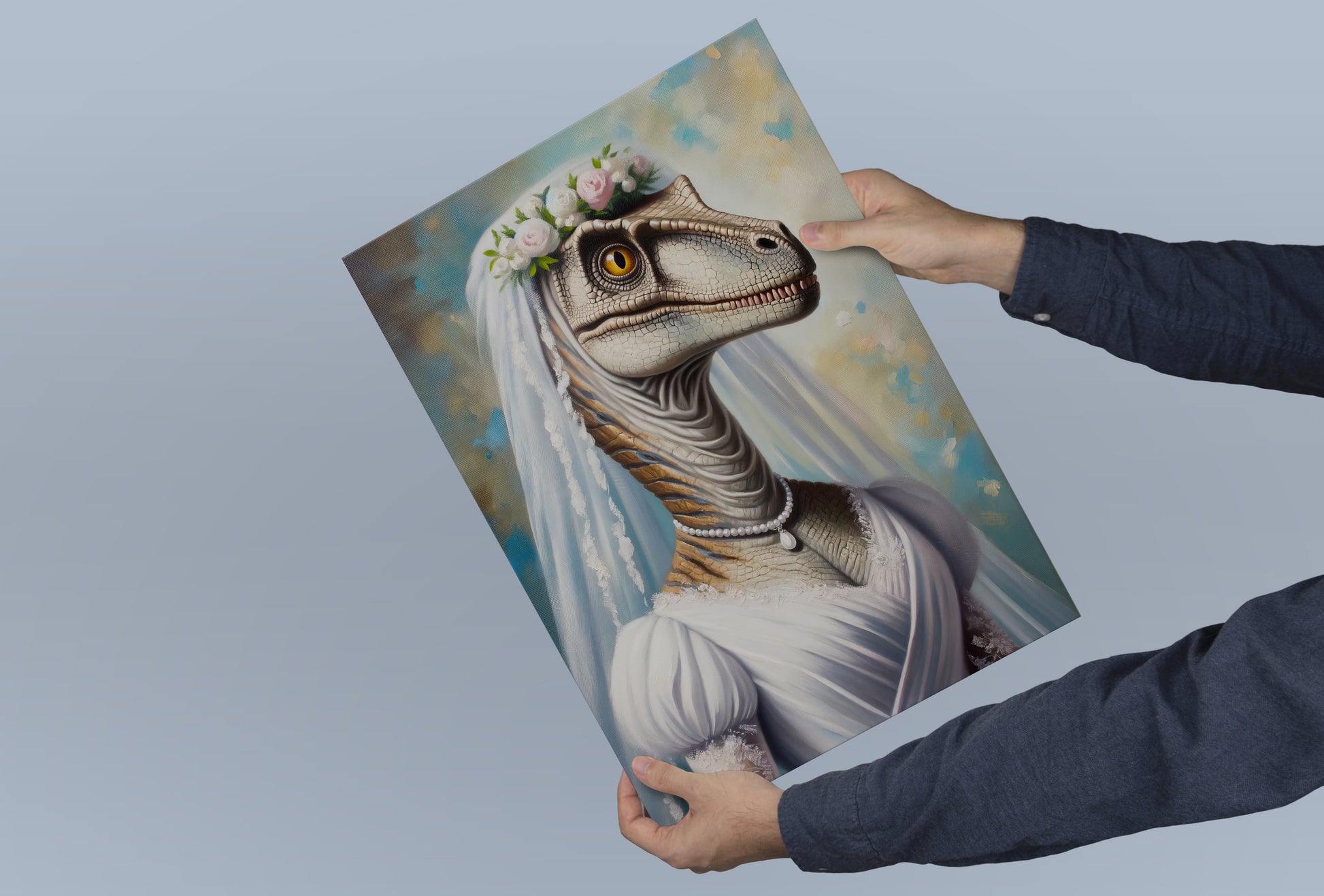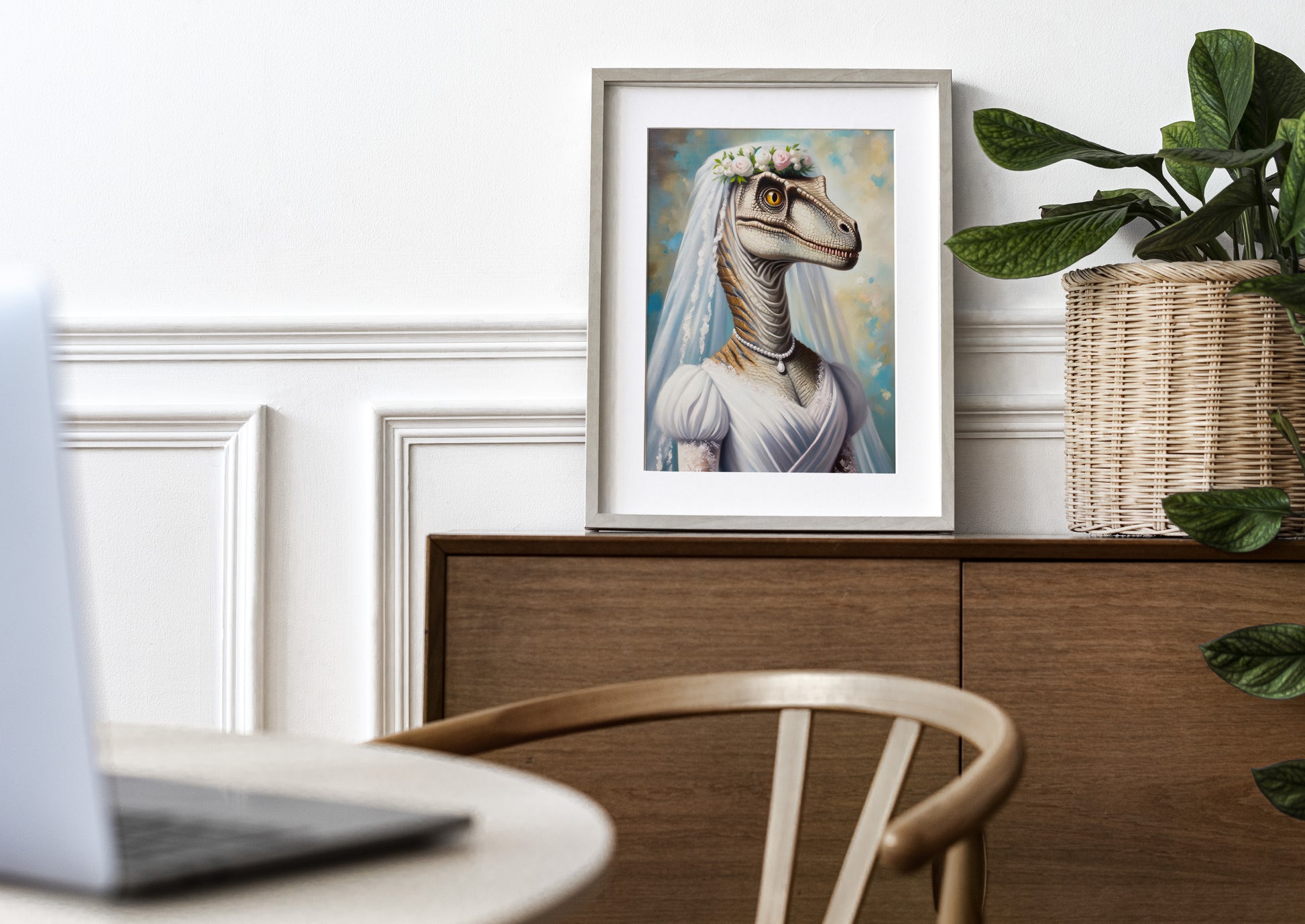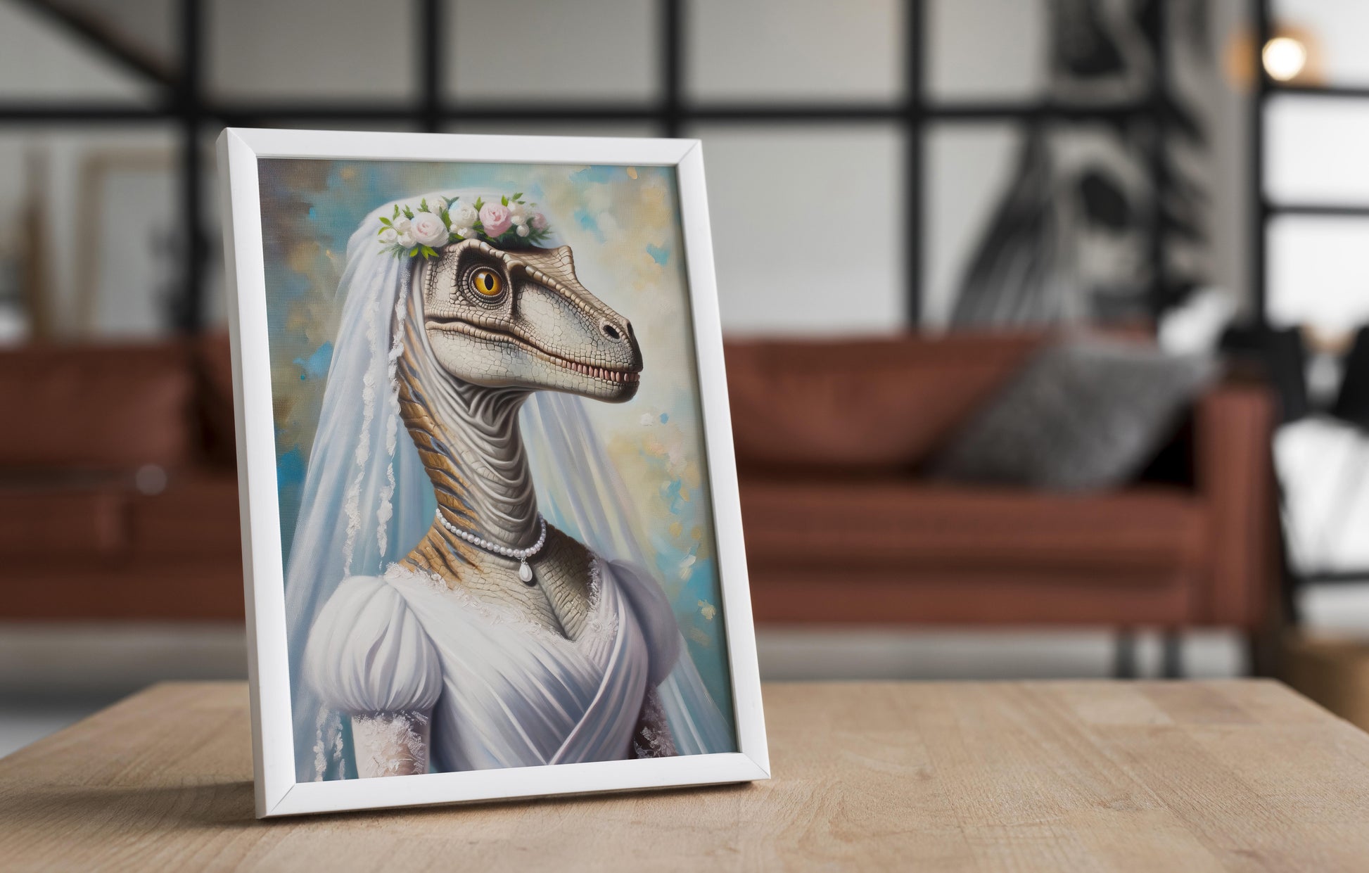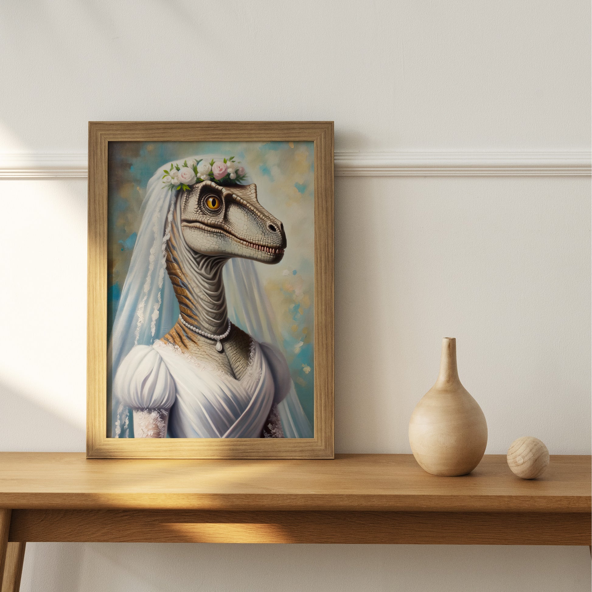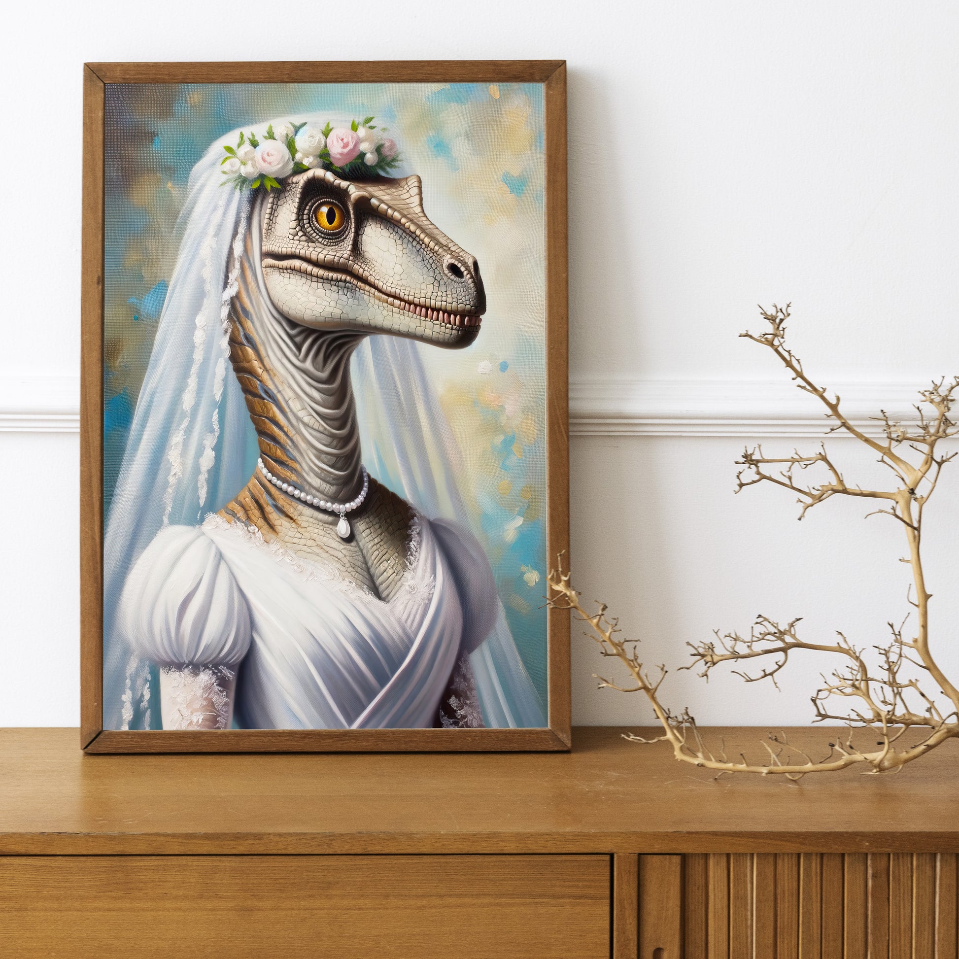 Portrait Vélociraptor en Robe de Mariée - Poster Dinosaure Décoration Murale Rigolote, Affiche Dino Mariage, Cadre Amusant