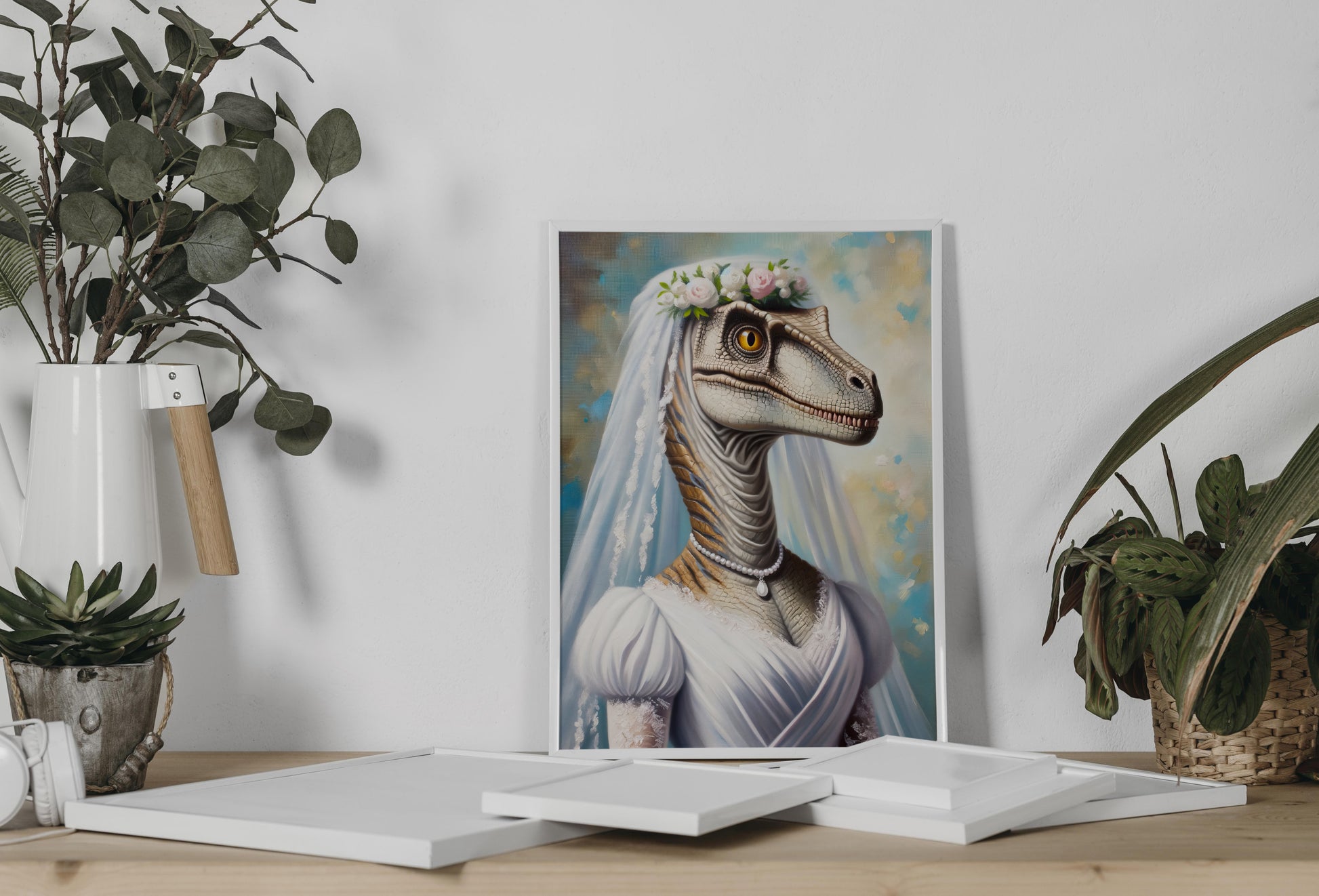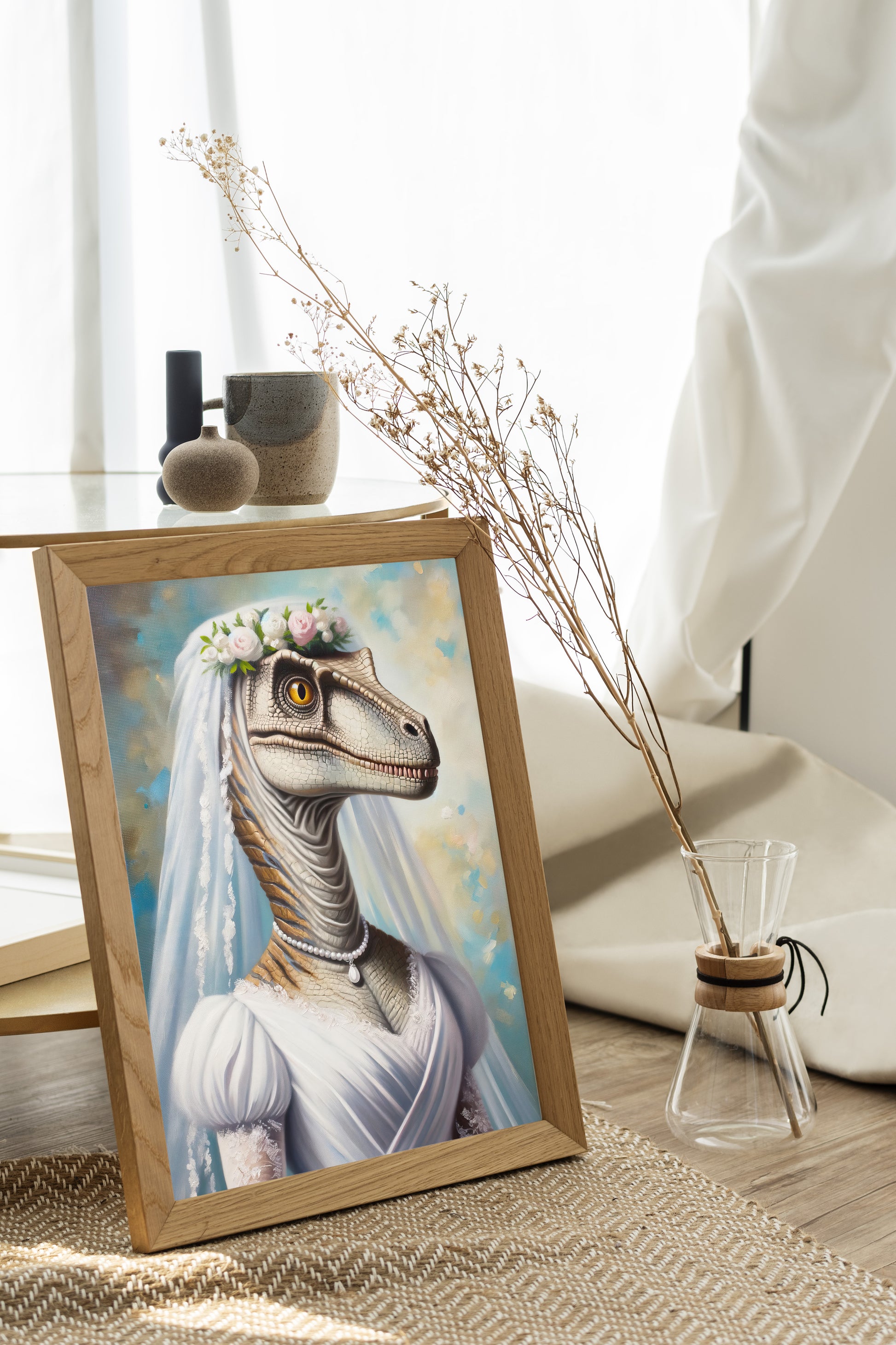 Avez-vous jamais imaginé un vélociraptor vêtu d'une robe de mariée ? Nos créateurs l'ont fait pour vous, en concevant un poster des plus originaux et divertissants. Il s'agit d'un choix décoratif audacieux qui apporterait une touche de fantaisie dans n'importe quel intérieur. Idéal pour offrir comme cadeau de mariage unique ou pour ajouter une pointe d'humour à votre propre espace de vie.